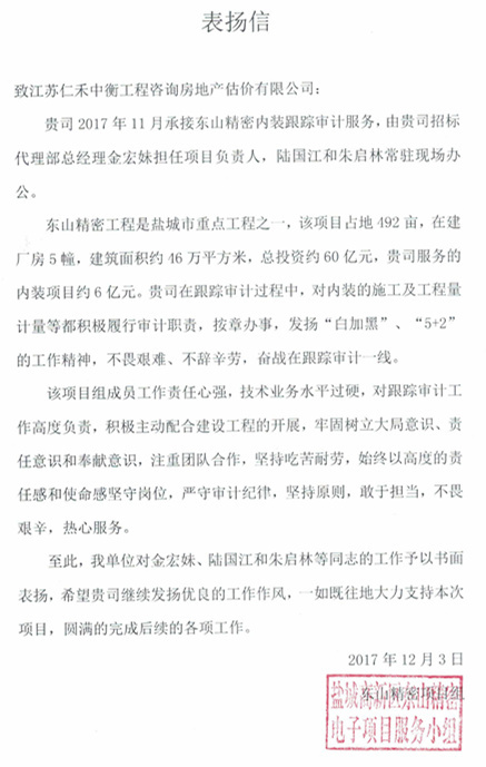 日前,集團收到一封來自鹽城高新區(qū)東山精密電子項目服務小組的表揚信。表揚信中,對集團金宏妹、陸國江、朱啟林同志在山東精密內(nèi)裝跟蹤審計服務中,所展示出敬業(yè)精神、奉獻精神、綜合素養(yǎng)及優(yōu)質(zhì)服務給予了高度評價。這再一次向社會各界充分展示了集團的綜合實力及品牌形象。